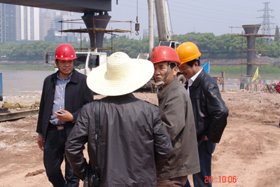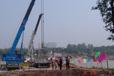 据燕尾洲景观公园工程致远监理部张福明介绍,本计划定于4月25日一次性连续起吊义乌江截流段上三段桥梁的,由于4月24日上游突涨大水,冲垮了义乌江截流段堤坝,只好改由两边分段起吊。根据金华历年汛期情况,燕尾洲景观公园工程指挥部要求在5月15日前将义乌江和武义江上的桥梁安放完毕,保证汛期通水。