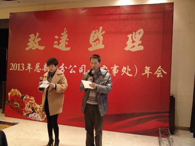 年会在主持人“蛇奔前程去,马携好运来。……”的祝词中拉开了帷幕,接着公司总经理赵肖春作了讲话:2013年是一个丰收年,在此对大家一年的辛苦劳作表示感谢,并希望再接再厉,来年创造更加辉煌的业绩。随后,赵总举杯向大家敬酒:希望大家开怀畅饮,把一年的辛苦抛掉,振作精神,迎接新的挑战。