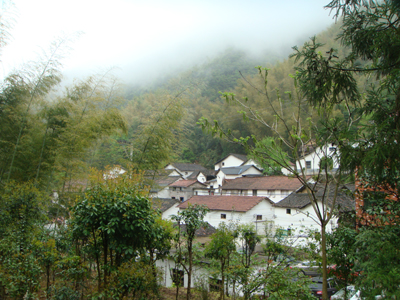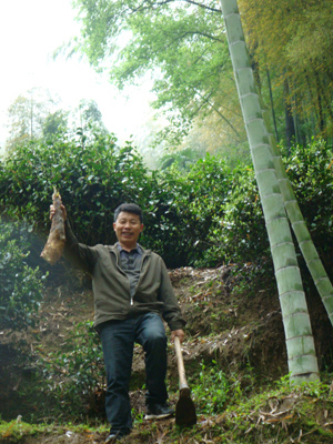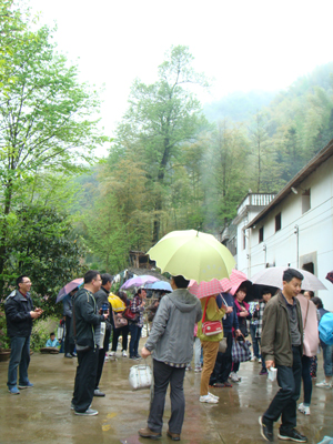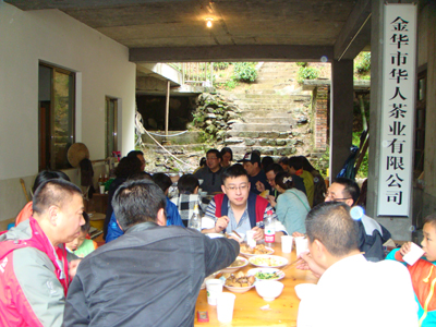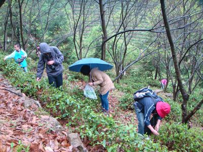 车队沿着安琴公路徐徐前行,途经安地、郑宅、山道、琴坛至南坑,用时一个半小时。如此规模的队伍到来,使原本幽静的南坑村顿时热闹了起来。下得车来,放眼望去,周围群山环绕,云雾飘渺其间,山峰若隐若现,人置其中,宛若仙境一般。欢呼雀跃的人群跨过小溪,沿着石径小路拾阶而上,首先来到村邹支书家,热情的主人拿出采茶篓和编织袋,把队伍分编成两队,一队围上茶篓上前山采茶,一队拿着编织袋上后山挖笋。随后,队伍浩浩荡荡分两路进军山中。采茶的以妇女和儿童居多,挖笋则以男同胞为主。采茶的一队跨过小溪,沿着山间小路蜿蜒而上,约行一公里,一有坡度的梯形茶园展现在人们的面前,大家迫不及待围着茶树就采起茶来了,虽然天空下着毛毛雨,大家却兴致很高,不一会,每个人都有不少的收获。挖笋的一队则直上后山毛竹林,因为坡较陡,性急的人因此被滑倒,但竹笋美味的诱惑,挡不住他们找笋的热情,个个争先恐后,有人收获还是挺丰的。