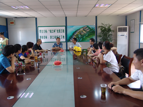 在工地的会议室中,项目建设方负责人、金华市民政局周工对该项目进行了详细的介绍:开发区养老公寓项目工程占地40余亩,原为苏孟乡小学和中学地块,由金华市民政局与金华开发区共同兴建,拟建7幢公寓、600个床位的中高档养老小区,养老小区每幢楼一楼都凌空,以方便老人休息和活动,小区建设划分几个功能区域,有不能治理的老人楼、有夫妻老人楼、有特殊情况老人楼,相对实现动静区分离。每幢楼之间及食堂都有风雨走廊相连,小区内活动不受风雨影响。小区内还配有活动楼、会议楼、医务室、食堂、超市等配套设施,该养老公寓还有一个最大的优势是小区对面就是苏孟乡卫生院,就医条件非常方便。周工的介绍使大家对自身未来养老生活也产生的强烈的兴趣,都说自己的老年如能生活在这样的环境中而欣慰,并笑言能否先预定一下。