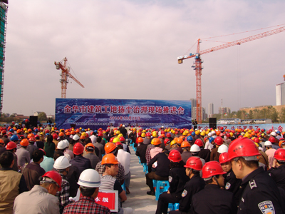 10月28日上午,金华市建筑工地扬尘治理现场推进会在多湖横塘沿社区搬迁安置房一期工地举行,有全市建设、监理、施工单位600多人参加了会议,我公司总工张宝玉和市区二环路范围内在建工程项目经理总监等20余人参加了此次现场观摩会。