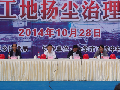 会议第三项是经验交流 。建设单位金华市区城中村改造工作领导小组办公室规划建设管理处处长舒慧斌、施工单位代表新世纪建设集团有限 公司副总经徐旭洪、监理单位浙江致远建设工程咨询监有限公司项目总监童健波介绍建筑施工扬尘防治经验。