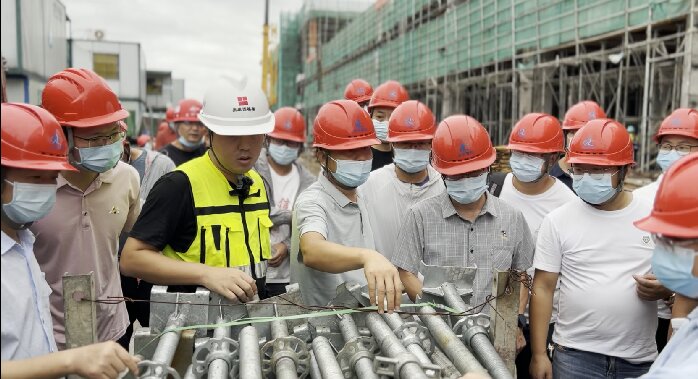 接着,大家移步到施工现场观摩。技术人员向大家讲解了盘扣的材料材质、规格、质量的辨别控制;介绍立杆、横杆、斜拉杆、标准基座、可调顶托、盘扣架底座、双槽托梁及U托支撑衡梁、长丝杆的搭设要领。公司总工张宝玉也对盘扣架构造原理、底座与基座的使用,架体搭设标准、主次梁交接重要节点搭设注意事项等进行现场指导教学,让参会总监充分了解到盘扣式脚手架施工快捷、节省费用、安全可靠等优点。