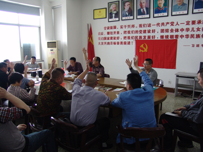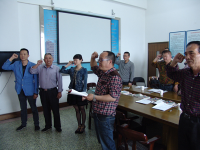会议第四项议程是新党员入党宣誓仪式。去年转正的施琪、韦祖高、金浩三同志在党旗面前进行了入党宣誓,其它党员也重温了入党誓言。